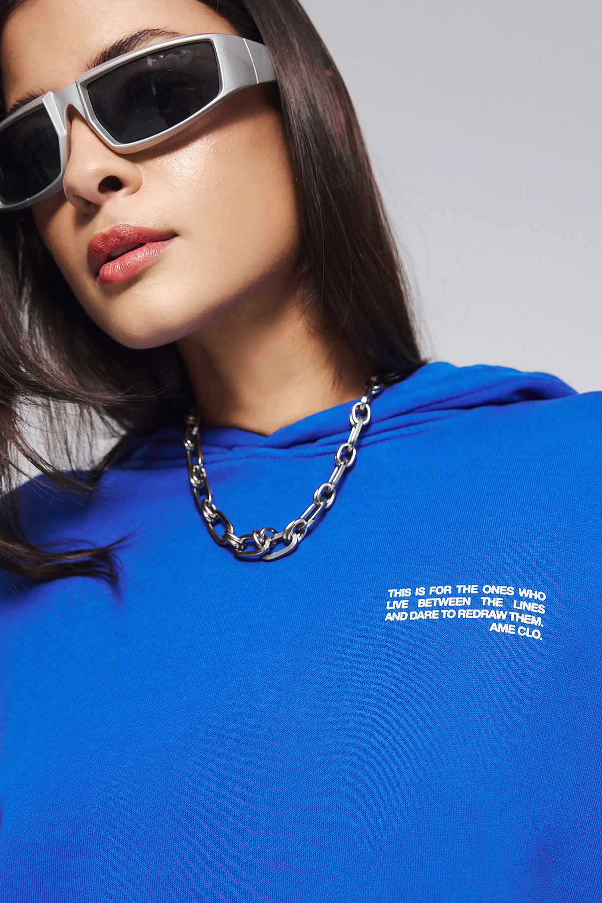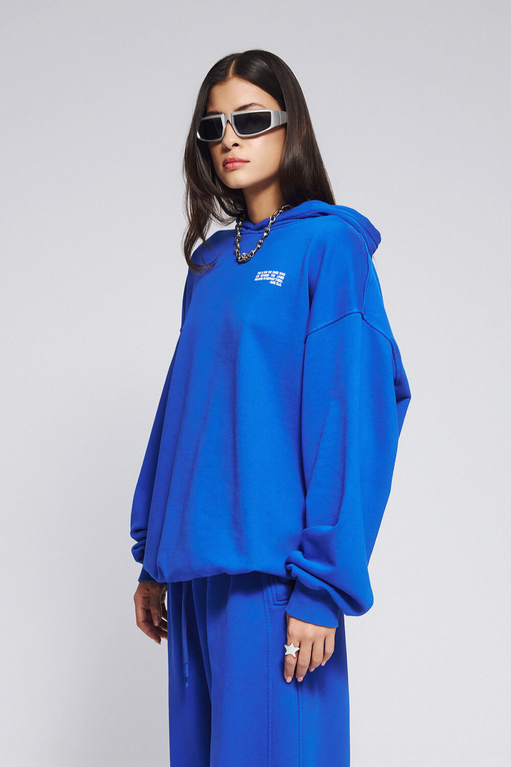 Μπλε oversized φούτερ χωρίς χνούδι με κουκούλα από 100% οργανικό βαμβάκι, με απαλή υφή και δομημένη εφαρμογή.