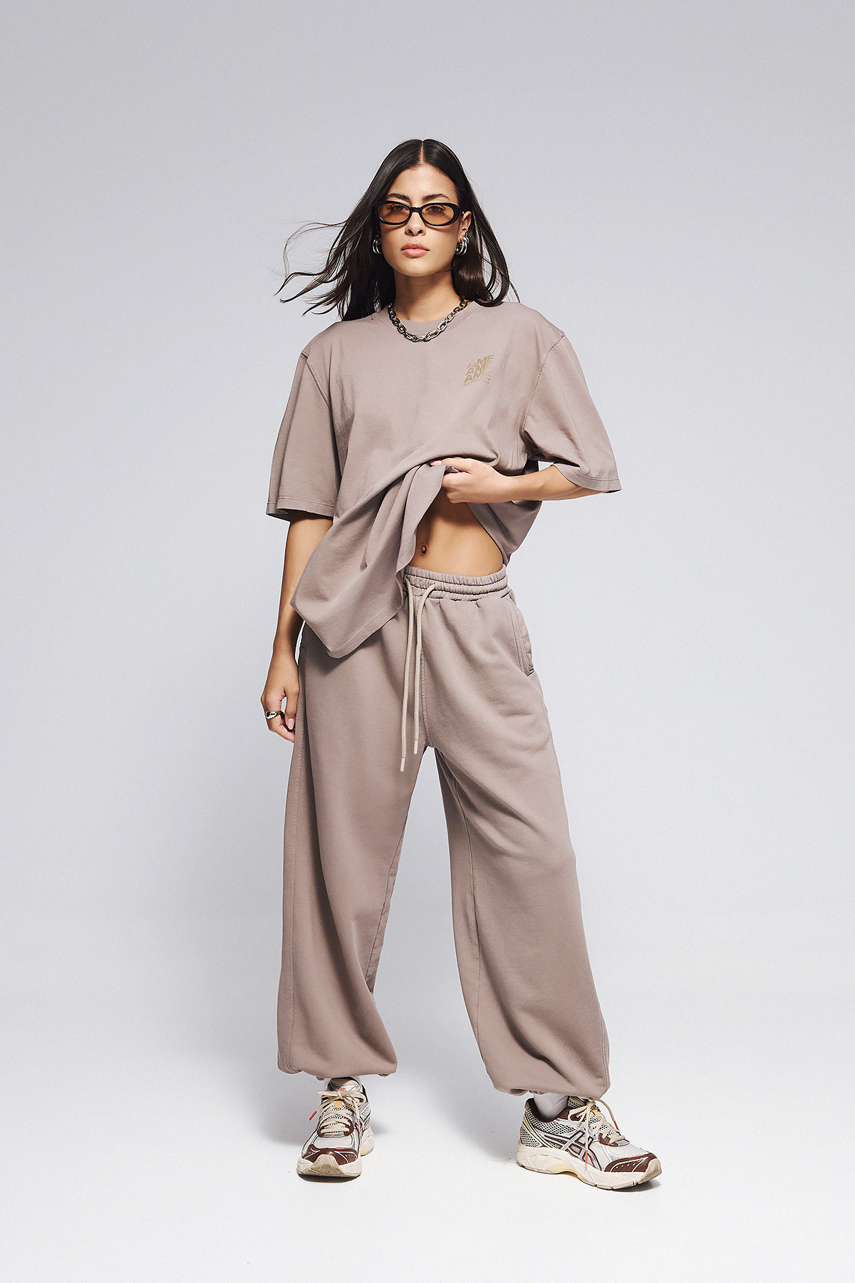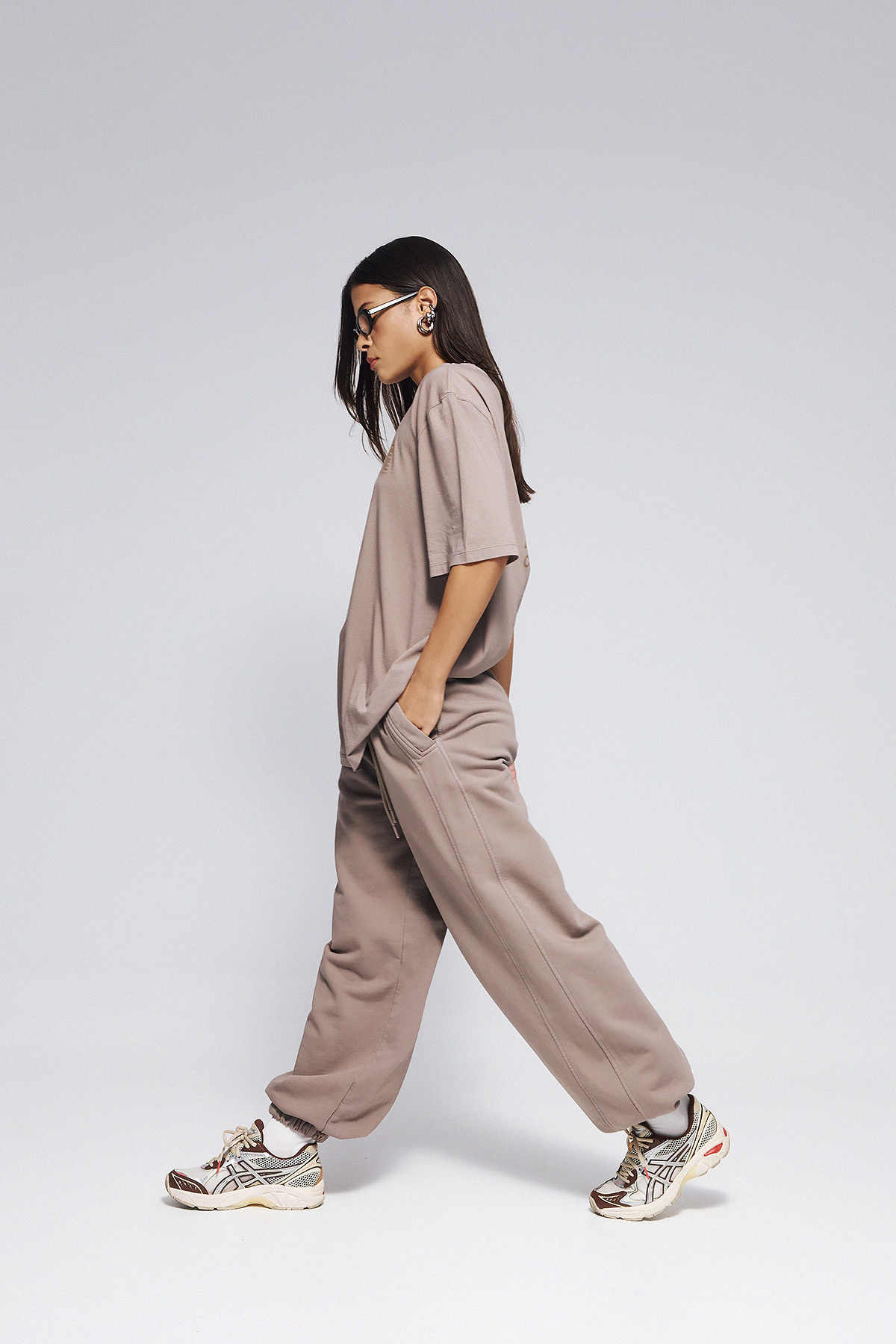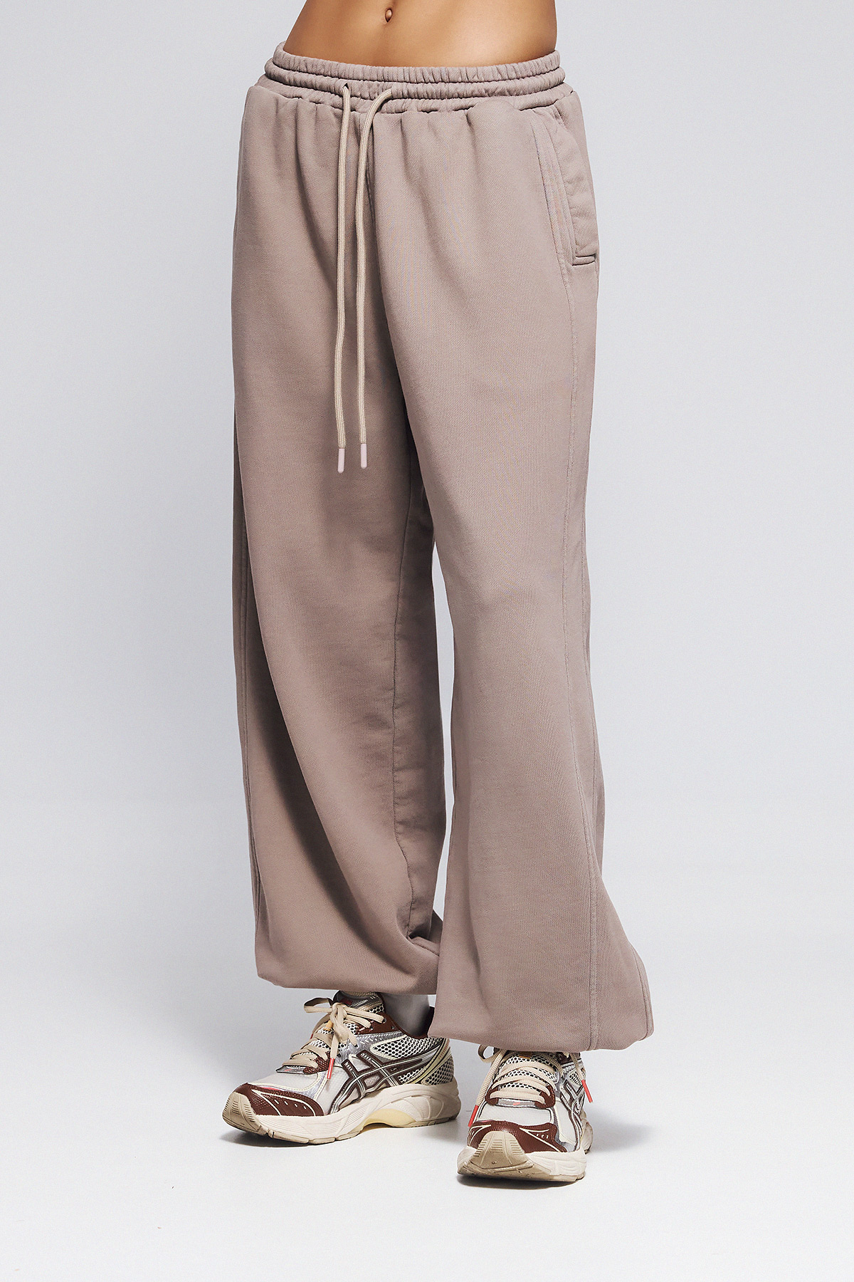 Kαφέ παντελόνι φούτερ χωρίς χνούδι από 100% οργανικό βαμβάκι, με λάστιχο και ρυθμιζόμενο κορδόνι στη μέση.